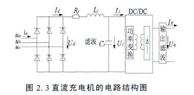 直流充電樁電氣系統三相電網輸入交流電,經過三相橋式不可控整流電路整流變成直流電,濾波后提供給高頻DC-DC功率變換器,功率變換器經過直直變換輸出需要的直流,再次濾波后為純電動汽車動力蓄電池充電。
